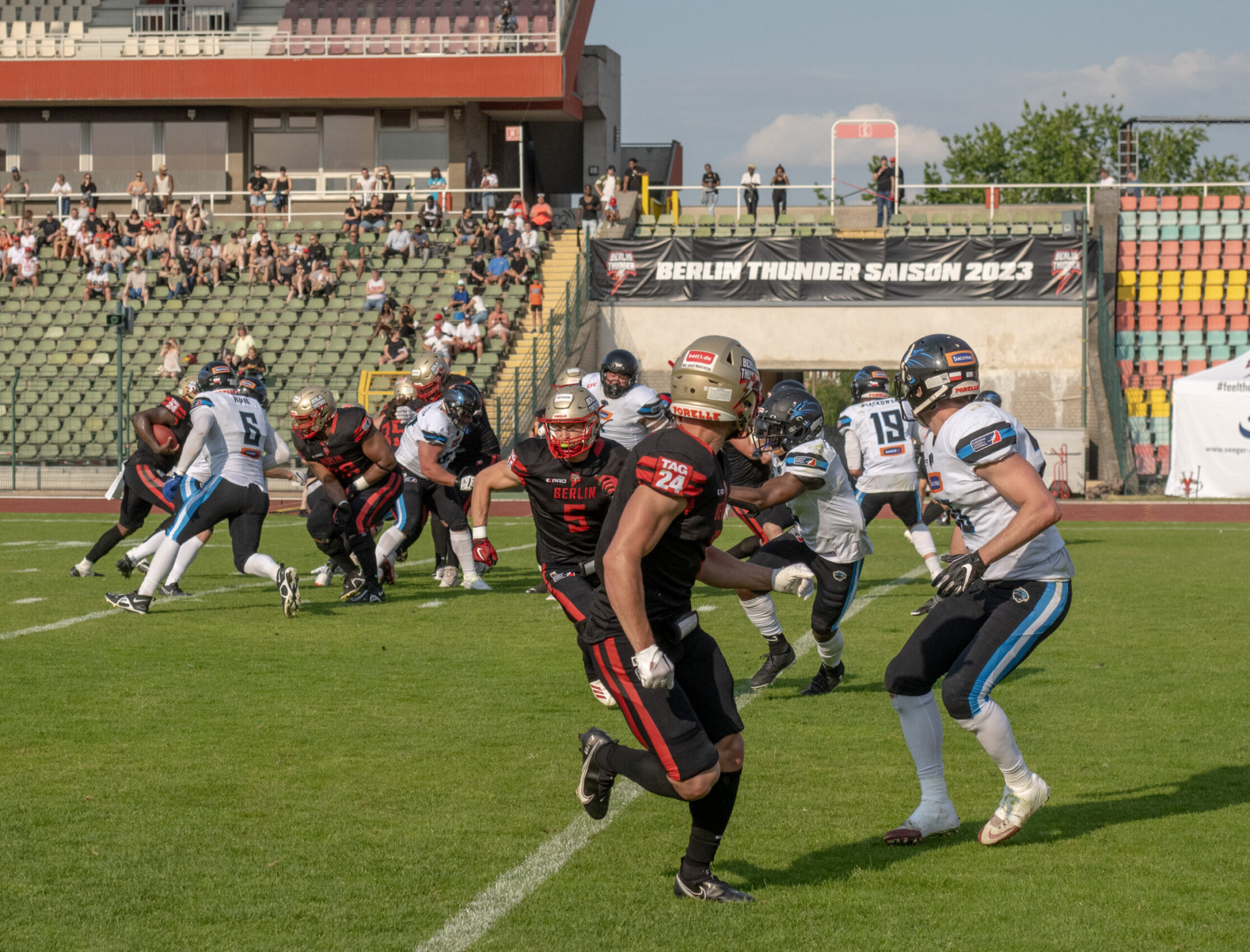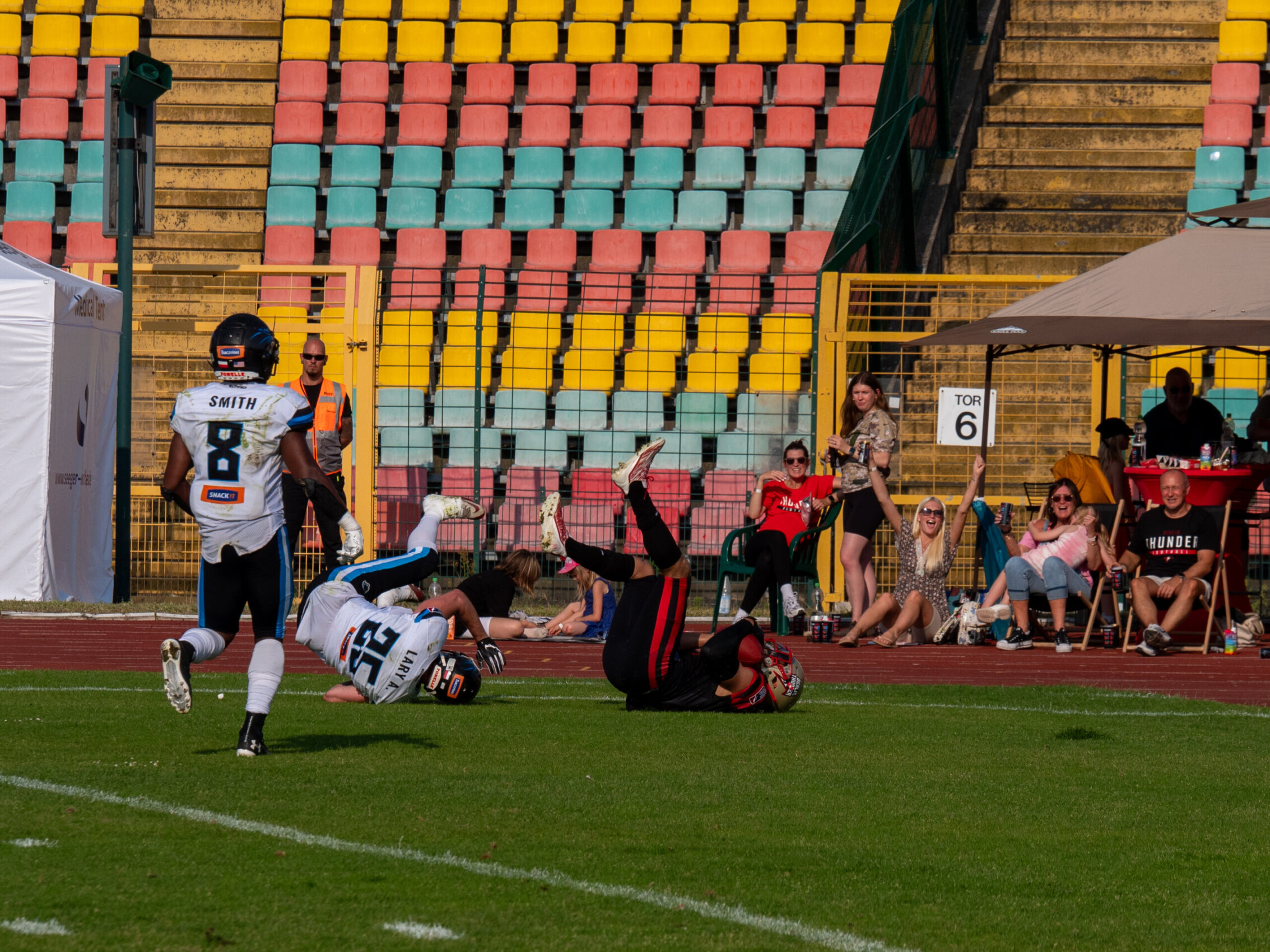 Nach der unglücklichen Niederlage vor einer Woche gegen die Vienna Vikings wirkten die Berliner gleich von Beginn an wesentlich konzentrierter und entschlossener. Das zahlte sich dann auch mit einer souveränen Leistung in den ersten drei Vierteln aus. Daran änderte sich auch nichts, als die Polen mit zwei Touchdown die hohe Führung verkürzten. Das ganze Spiel über hatte man eigentlich nie das Gefühl, das die Thunder verlieren könnten.